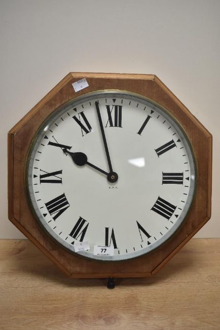 A 20th-century G.P.O. wall clock, later converted to quartz movement, now housed in it's original case, 38cm.