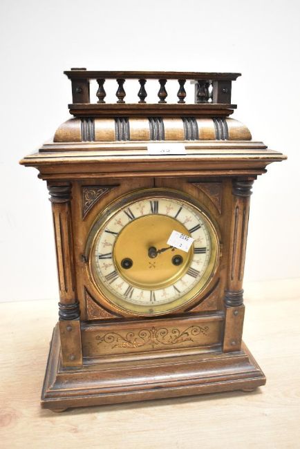 An early 20th-century German Wurttemberg H.C.A. (Hamburg American Clock Company) '14-day strike' mantel clock, featuring baluster-like carvings, columns, Roman numerals, and a moulded base, 37cm.