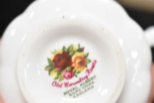 A mid 20th-century Royal Albert bone china 'Old Country Roses' dinner and tea set, featuring repeated burgundy, pink, and yellow rose motifs with gold-coloured banding, to include teacups, a three tier cake stand, teapots, plates, cups, salt and pepper shakers, and more, (80 piece).