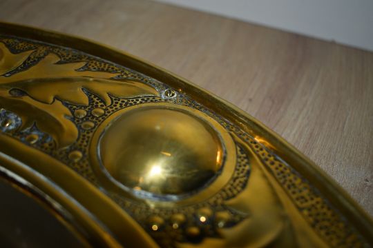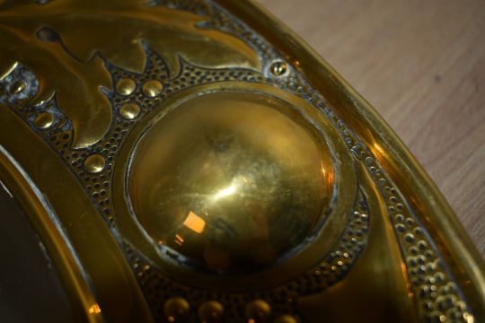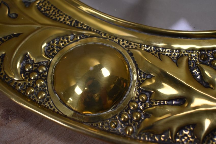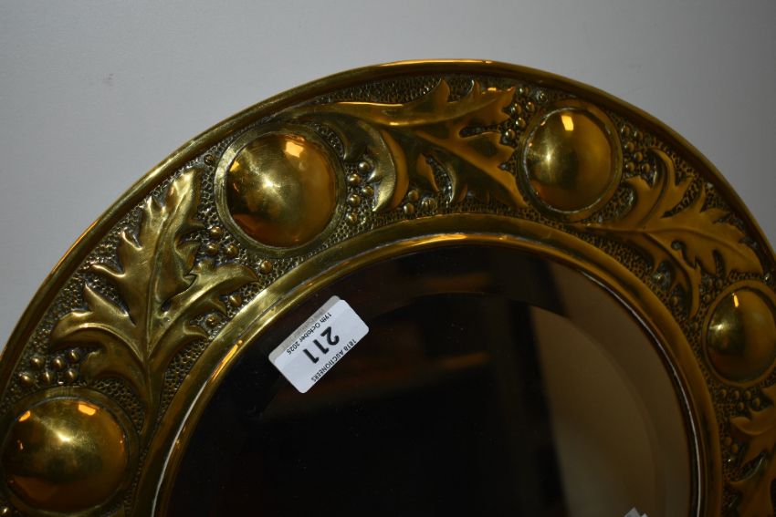A 20th-century Keswick School of Industrial Arts (KSIA) Arts and Crafts brass wall mirror, featuring hammered low-relief decoration with a holly and berry design, raised bosses, mounted on a wooden back, unmarked, as is often the case with Keswick mirrors, measures 38cm across.