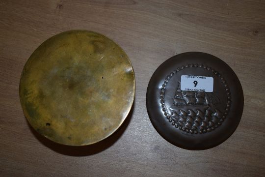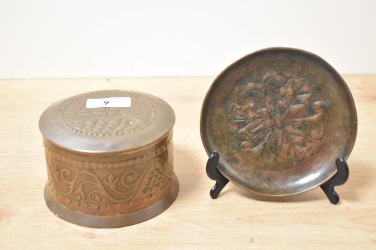 A 20th-century Arts & Crafts decorated copper box, in the manner of The Newlyn School, of cylindrical form with a nautical theme, the lid depicting a sailing ship in relief and adorned with repeated swirling floral motifs to the midsection; sold together with a textured copper jewellery dish featuring a central floral design, both unmarked, (2).