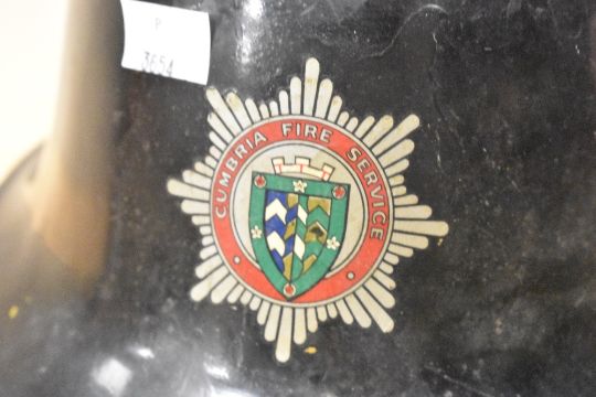 A mid-20th-century Cumbria Fire Service fireman’s helmet, fibreglass shell, with leather chin strap and cushioned lining, with rear and front peaks, an item of local interest, marked to inside, 37.5cm.
