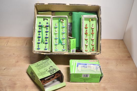 Subbuteo, Five 00 Scale Teams New Continental Equipment, all with damage, most complete and all boxed along with extra damaged players in box, C122 Set 2 New Type Goals boxed, Match Score Recorder part boxed, modern footballs x3 boxed, matt and damaged lights