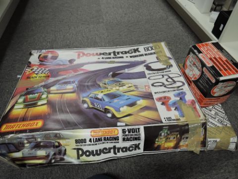 Matchbox Powertrack, Siverstone 8000 4 Lane Racing, all four cars present and appears to have very little use, box damaged, internal packaging good, along with a pack of Curves and a Lap Counter both also in damaged boxes