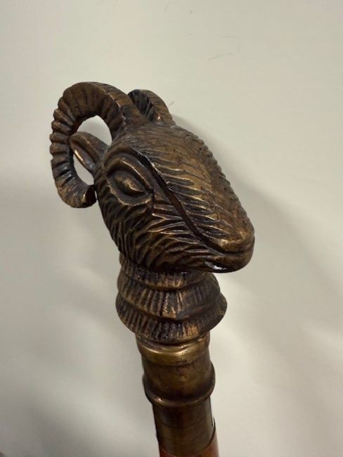 A Three section screw together walking stick with a cast sheeps head handle and a brass ferrule to the base measuring 98cm long