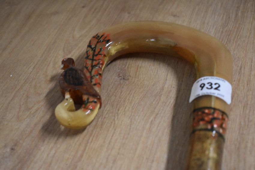A Hazel walking stick with carved crook handle carved into a grouse with heather decoration measuring 130cm long