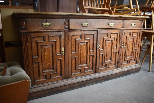 A Victorian oak sideboard having brass aesthetic style handles and cushioned style door fronts, width approx. 196cm (also fitted with smooth running castors