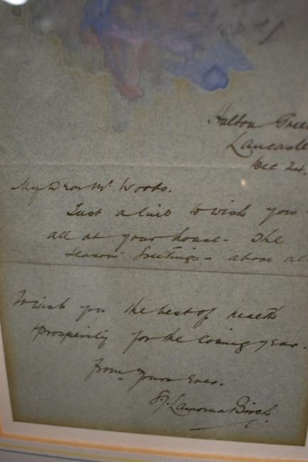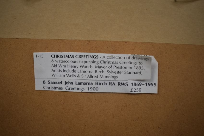 Local interest* Samuel John Lamorna Birch (British 1869-1955) Illustrated hand-written letter from the artist sending well wishes, the sketched watercolour illustration 'Halton Green, Lancaster' within a washline card mount and moulded gilt frame, under glass 24cm x 11cm & 45.5cm x 30.5cm overall