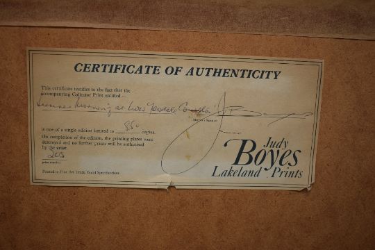 *Local Interest* After Judy Boyes (British b.1943) Limited edition 'Summer Morning at Low Yewdale, Conistion' a charming depiction of a Lakeland farm, to margin lower left edition number '205/850' title to centre and signed in pencil to lower right, certificate of authenticity and artist biography verso, within stepped washline mount and moulded gilt frame, 48.5cm x 33cm & 68cm x 54.5cm overall.