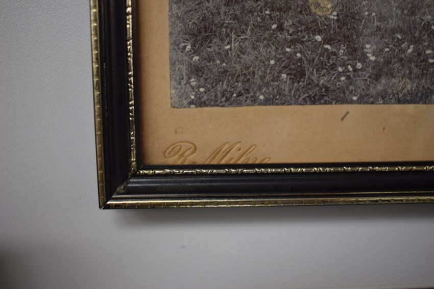 After Robert Milne (British 1865 - 1952) Monochromatic photographic print of Queen Victoria alongside Princess Helena Victoria of Schleswig-Holstein, Princess Marie of Baden Princess of Leiningen, Princess Victoria of Wales, Princess Henry of Prussia, Prince Waldemar of Prussia, Prince Sigismund of Prussia and Prince Maurice of Battenberg, royal crest to margin centre and embossed photographers signature left, signed by Queen Victoria and all royals present verso along with location and date 'Balmoral June 14 1898', in a moulded frame, under glass 28cm x 21.5cm & 32cm x 26cm overall, frame loose at top.