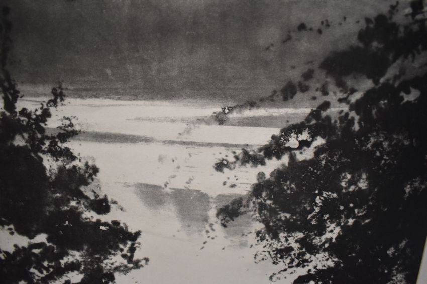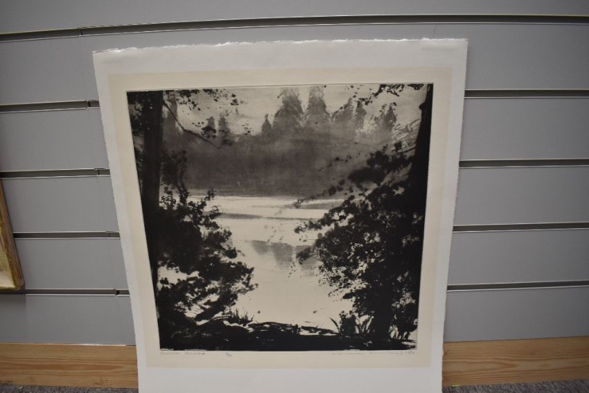 After Norman Ackroyd (British 1938 - 2024) Etching and aquatint 'Fonthill Revisited' a monochromatic piece with silhouetted trees and lake, titled and numbered (16/90) in pencil to lower left and signed and dated (1980) to lower right, unframed 42cm x 42cm & 50.5cm x 56.5cm overall.