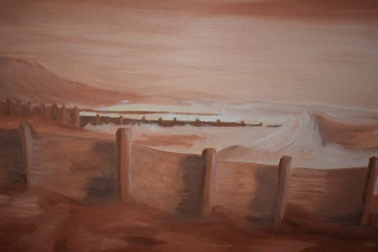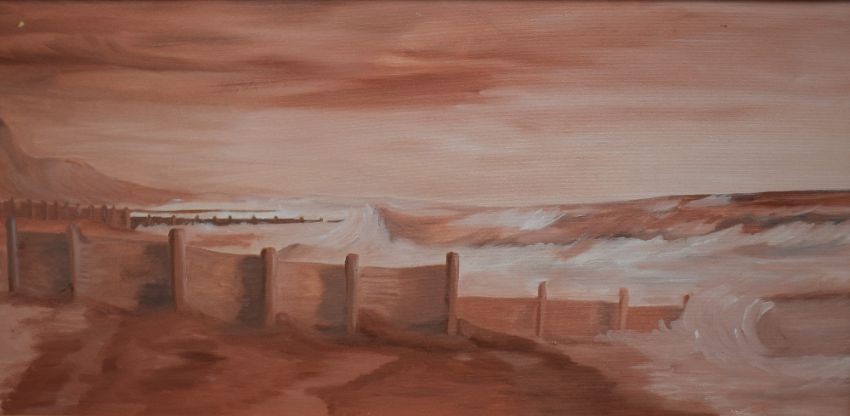 Contemporary acrylic on board, a beach scene in pink tones depicting waves breaking along groynes on the shore, unsigned, within a flat wood frame, 58cm x 28cm & 63.5cm x 33cm overall.