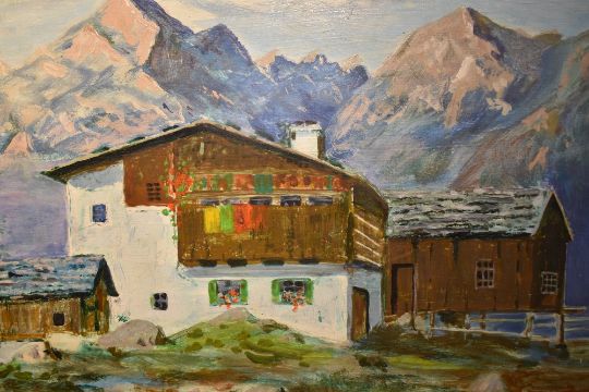 I. S. Cameron (British 20th century) oil on panel 'Alpine Chaley' signed lower right, entitled in ink verso, within a moulded mahogany frame