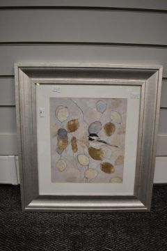 After Colleen Sarah (contemporary) a pair of Lithographs entitled 'Gentle Nature' depicting two black capped chickadee birds amongst leaves, printed signature to lower left and lower right, title and attribution verso, within card mounts and silver coloured moulded frames, under glass 24.5cm x 29cm & 45.5cm x 50cm overall.