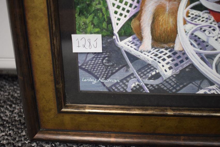 *Local Interest* Lesley Newman (British Contemporary) Acrylic on board 'Temptation' , depicting a small dog sat at a garden table with a plate of cake before him, signed lower left, entitled with artists details verso, within black card mount and moulded gilt frame, under glass 20.5cm x 21xm & 33cm x 33cm overall.