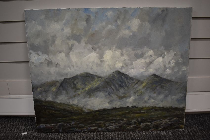 *Local Interest* M Wilson (British Contemporary) oil on canvas 'Glarmara and Allen Crags from Esk Pike' a view looking north over the mentioned fell tops, signed to lower left, titled verso, 91cm x 61cm overall. Sold along with a second oil on canvas by the same artist 'Kentmere after Rain. Yoke, Ill Bell, Froswick from Near Nan Bield' 76cm x 61 overall.