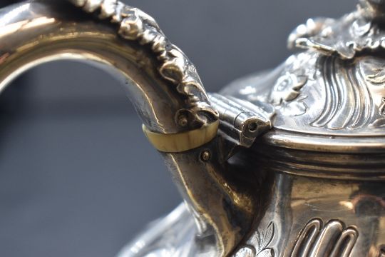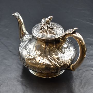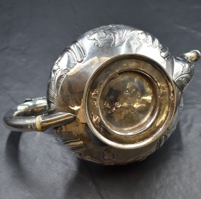 A William IV silver teapot, having an acorn finial over a squat bulbous body with floral scroll decoration with a stag heraldic crest and ivory insulators to the c-curve handle, raised on a moulded circular foot, marks for London 1833, maker Robert Hennell II, 434.3g. Ivory exemption reference EFCA61C9