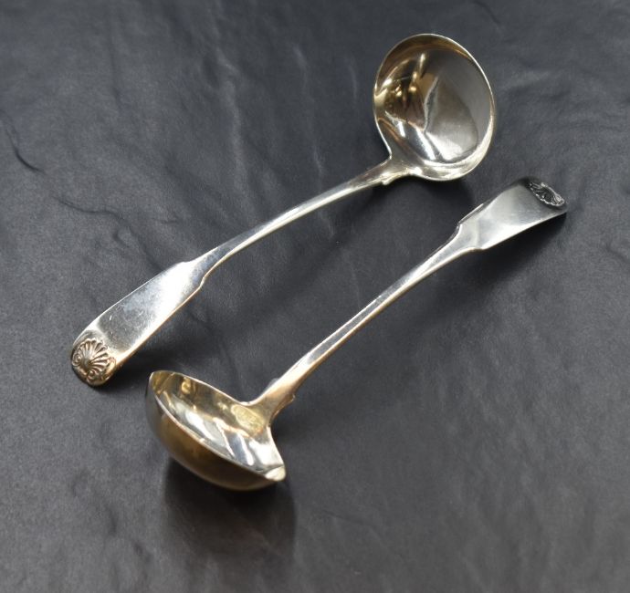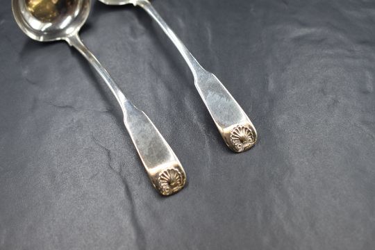 A pair of Scottish George IV silver fiddle pattern sauce spoons, having shell decoration to terminals, marks for Edinburgh 1823, maker William Robertson Edmonstoun, 56g gross