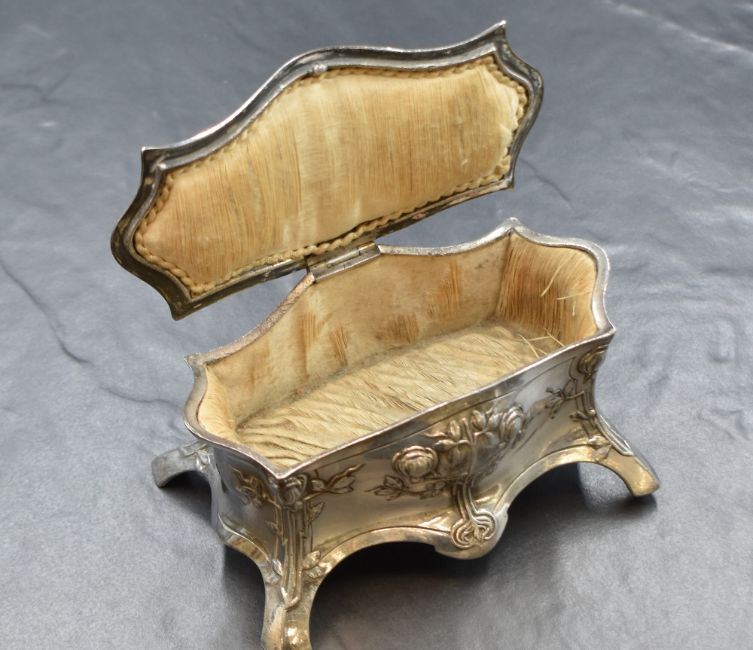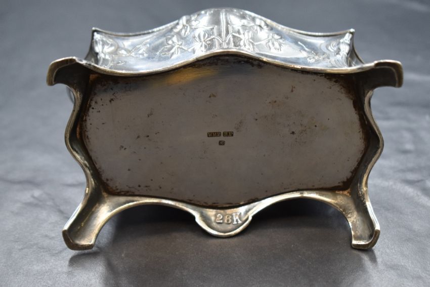 A 20th century Wurttembergische Mettalwaren Fabrik (WMF) silver plated Art Nouveau style trinket box, of rectangular form having lobed sides with a floral motif finial over decorative floral work to the lid and body, raised on four splayed legs, marked WMF E.P OX