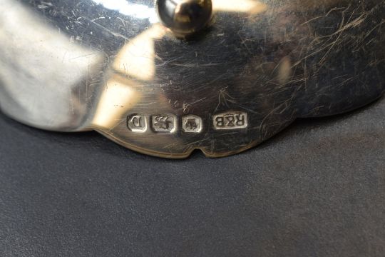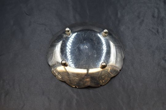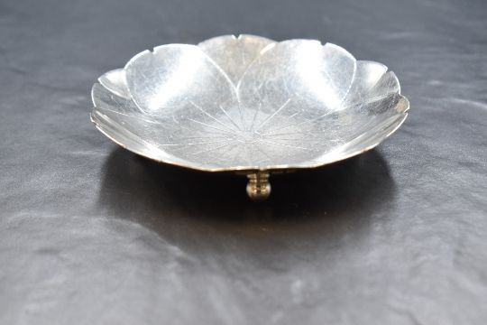 A George VI silver pin dish, of circular form depicting a lotus flower, raised on four ball feet, marks for Sheffield 1946, maker Roberts & Belk Ltd, 81.5g