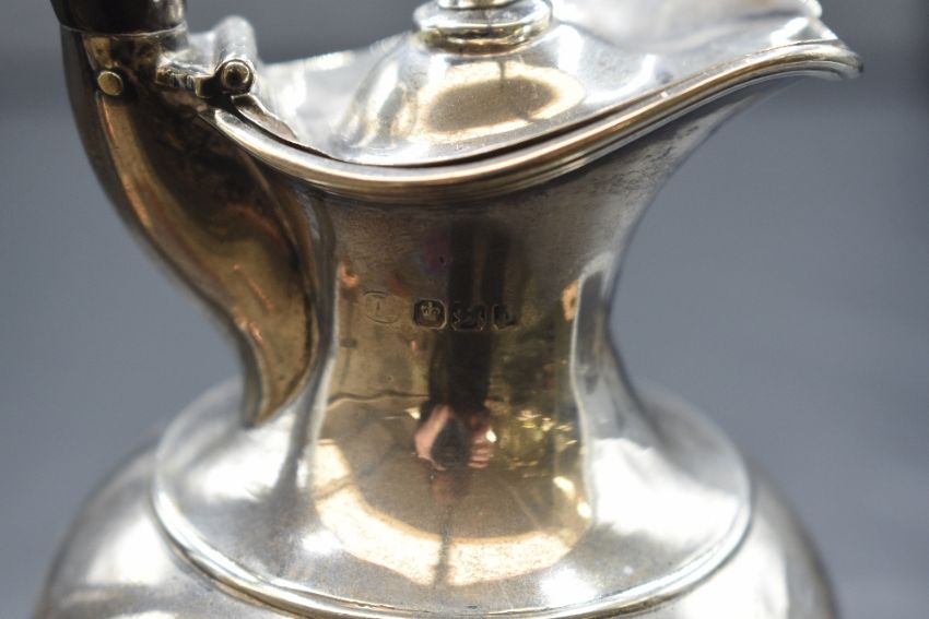 A late 19th century silver jug, of circular form, having a twisted finial over a flattened spout opposed by a scroll handle, raised on a circular step moulded foot, rubbed marks for Sheffield possibly 1894, rubbed makers mark, 17cm, 173g