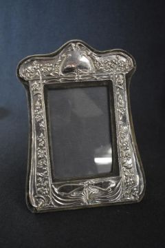 An Elizabeth II silver mounted photograph frame, of Art Nouveau style having a central dragonfly, floral borders and scrollwork, 23.5cm x 16cm, marks for London 1986, maker Keyford Frames Ltd, along with a further silver mounted photograph frame and a silver mounted hairbrush, marks for Sheffield, Chester 1912, 1993, maker Carr's of Sheffield Ltd