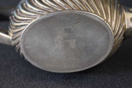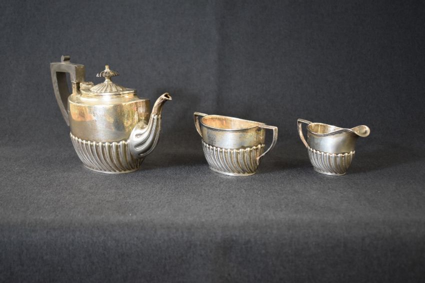 A late Victorian/early Edwardian silver three-piece tea set, comprising a teapot, sugar and cream, of oval form having half gadrooned bodies, raised on oval feet, marks for Sheffield 1901, maker Walker & Hall, 609g gross