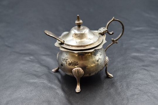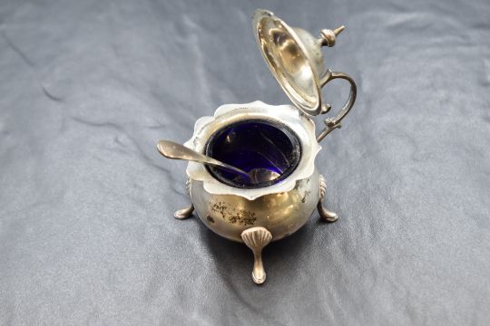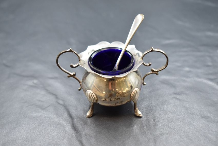 An Edwardian silver three piece cruet set, comprising a salt, mustard and pepperette, of bulbous form having Chippendale style rims raised on four cabriole style legs with silver condiment spoons and blue glass liners, marks for Birmingham 1907, maker J B R, 146g gross excluding blue glass liners
