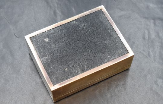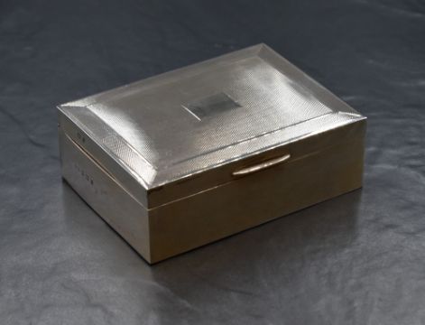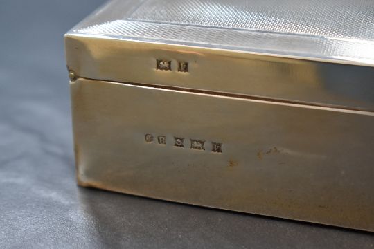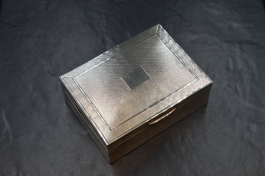 An Elizabeth II silver cigarette box, of hinged rectangular form having engine turned decoration and a vacant rectangular cartouche, with wooden lined interior, marks for Birmingham 1970, maker John Rose, 11.5cm x 8.5cm x 4cm, 326g