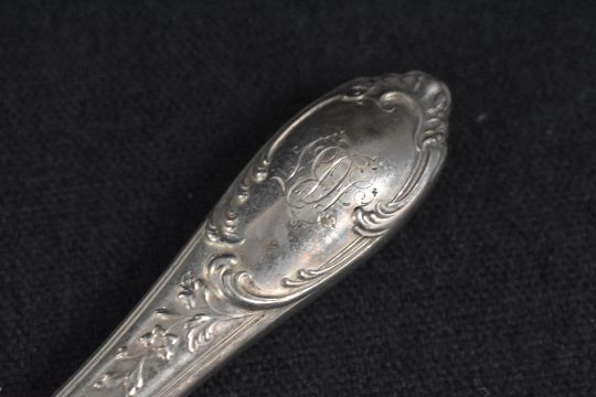 A set of twelve 19th century German white metal 800. grade handled knives, having thread and floral scroll decoration with 'HBT' monogram to terminals, marked 'Gebr:Somme' 800, 1044g gross