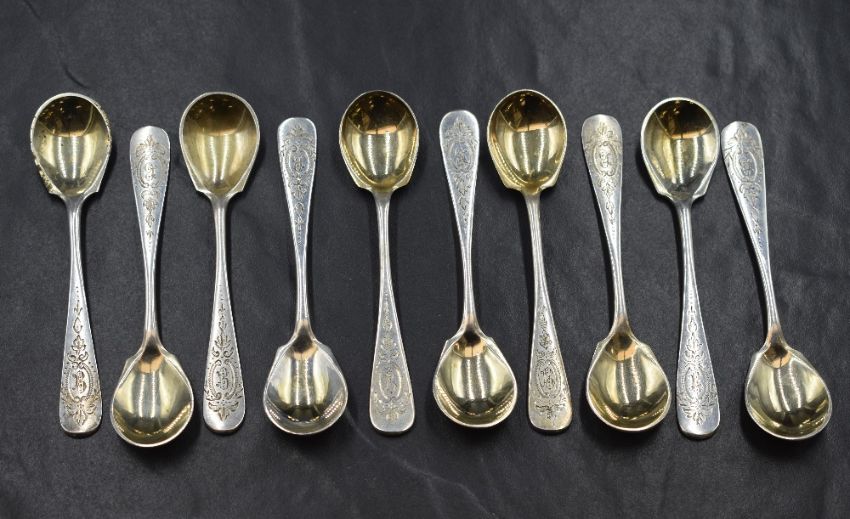 A group of ten white metal 800. grade condiment spoons, having floral decoration and 'B' initial to terminals, marked 800, with rubbed makers name, 107g gross