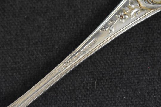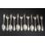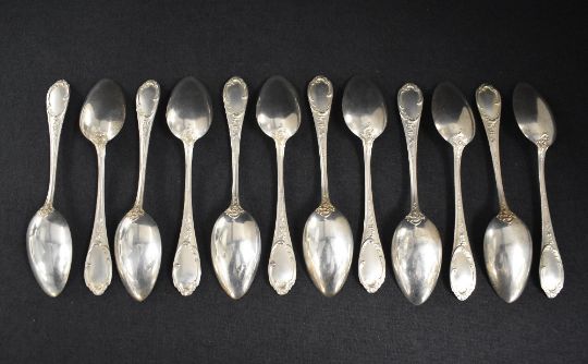 A set of twelve 19th century German white metal 800. grade serving spoons, having thread decoration and floral scroll cartouches to terminals with 'HBT' monogram, marked 'Gebr:Somme' 800, 812g gross