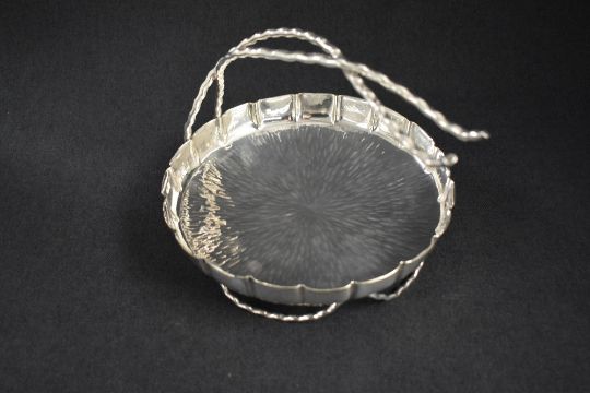 A pair of silver plated serving dishes, of circular lobed form having planished decoration, raised on textured swag feet extending up into an intertwined handle