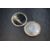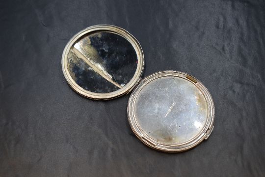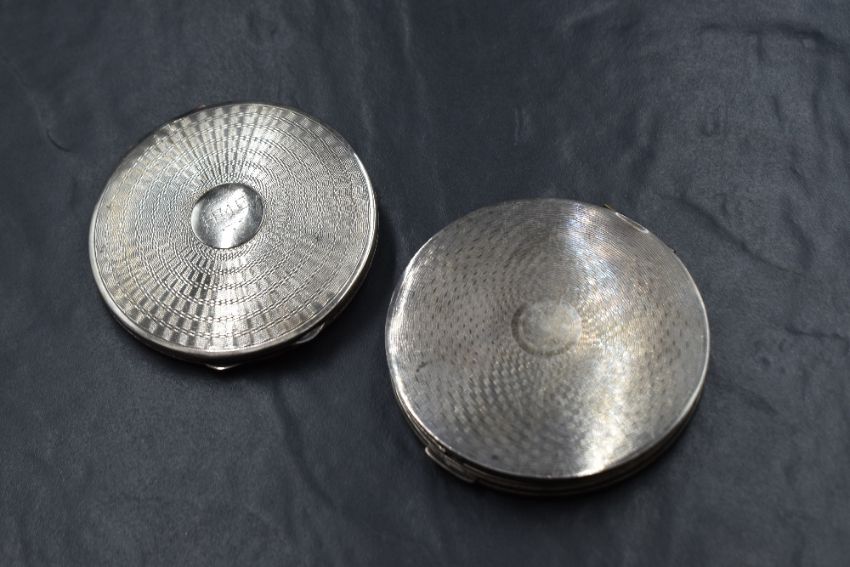 A George V silver makeup compact, having engine turned decoration and central circular cartouche engraved 'HME', marks for Birmingham 1934, maker Deakin & Francis Ltd, along with a further silver makeup compact, also having engine turned decoration, marks for Birmingham 1946, maker R Davis & Co, 171g gross. One is heavily damaged