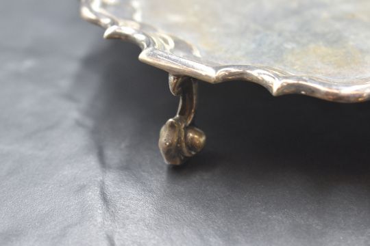 A George V silver salver, of circular form having a Chippendale style rim, raised on three scroll feet, marks for London 1923, maker Blackmore & Fletcher Ltd, 192g