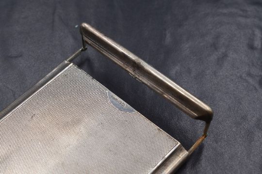 A George V silver cigarette case, of square form having an extending lid to the top and engine turned decoration, marks for Birmingham 1927, maker R H Jones & Sons, 9cm x 9cm, 128g