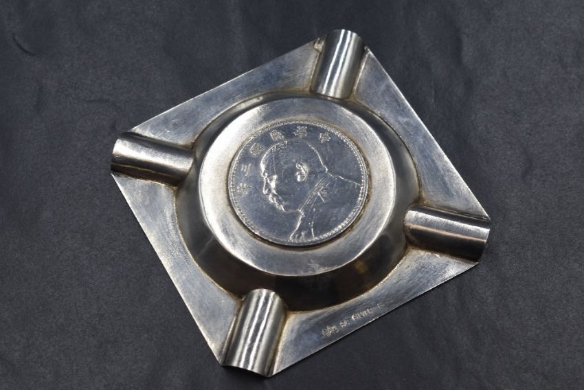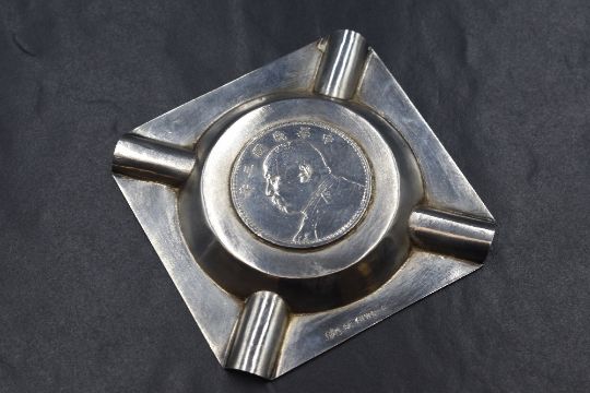 A white metal ashtray, of square form having planished decoration and 'White Dragon 1958' engraved, with a central Republic of China Yuan Shikai One Yuan coin to the centre, marked Silver 9c, 55g