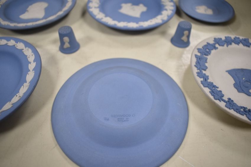 A Wedgwood jasper ware fruit bowl raised on a footed base, h13cm, sold together with a urn, thimbles and dish ect, (12)