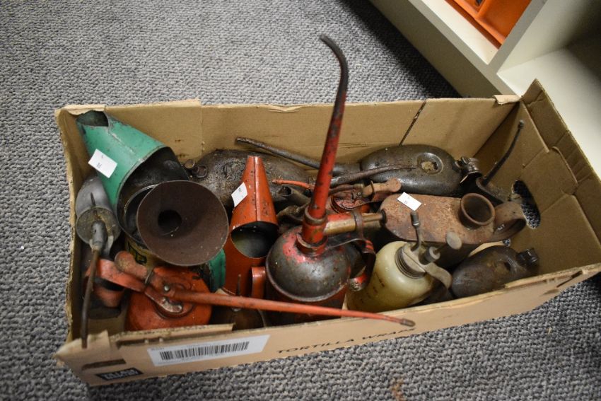 A selection of mid-20th-century petroliana, to include an array of metal oil or gas cans and funnels, (approximately 18), condition consistent with age and use, with areas of rust throughout.