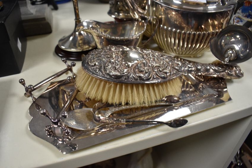 A collection of 20th-century silver plate and white metal ware, to include an ornately decorated bristled hairbrush of paddle form; a milk jug; a silver-plated teapot by W.M. Hutton & Sons; a silver-plated fruit or cake bowl on a pedestal with decorative relief pattern; and more, many pieces are marked to the base, (12), in used condition, with tarnishing and surface wear to the silver plate, this is consistent across all pieces.
