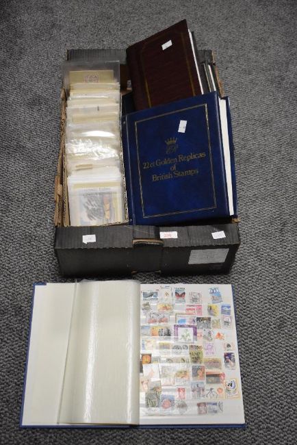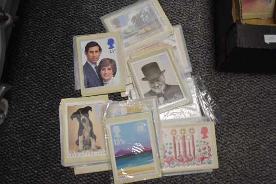 A mixed late 19th to 20th-century lot of postcards, stamps, and cards, including an amateur stamp book featuring stamps from Britain and the World, a Commonwealth stamp collection, a collection of postcard sets, and more, (4 books and approximately 68 postcard sets).
