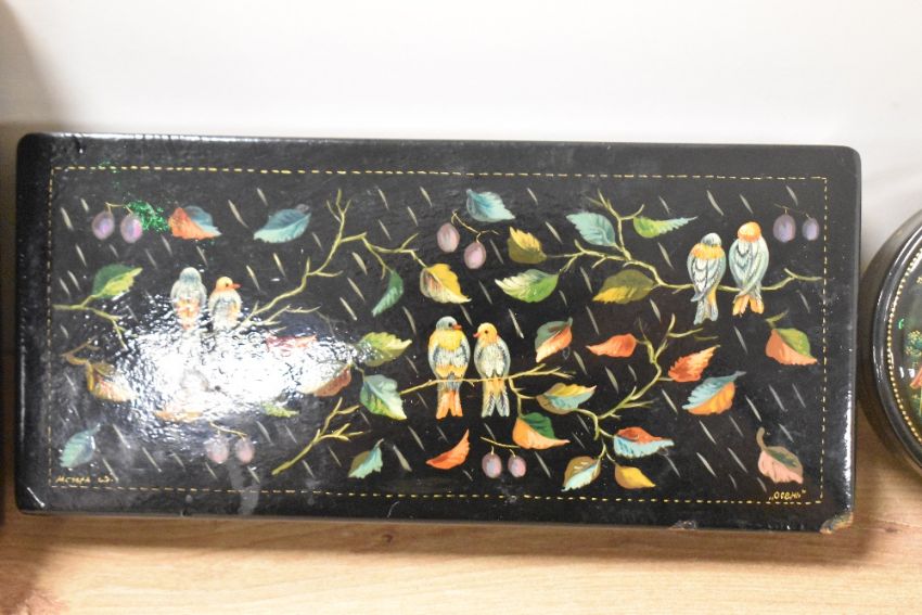 A collection of four 20th-century lacquered papier-mâché boxes, of rectangular, square and circular form, hand-painted with varying designs to include, for example, three pairs of lovebirds on branches in a storm, a floral Victorian-style motif, and two Russian examples of traditional heroic nature, (4), chips to the corners and lacquer of two boxes consistent with age.