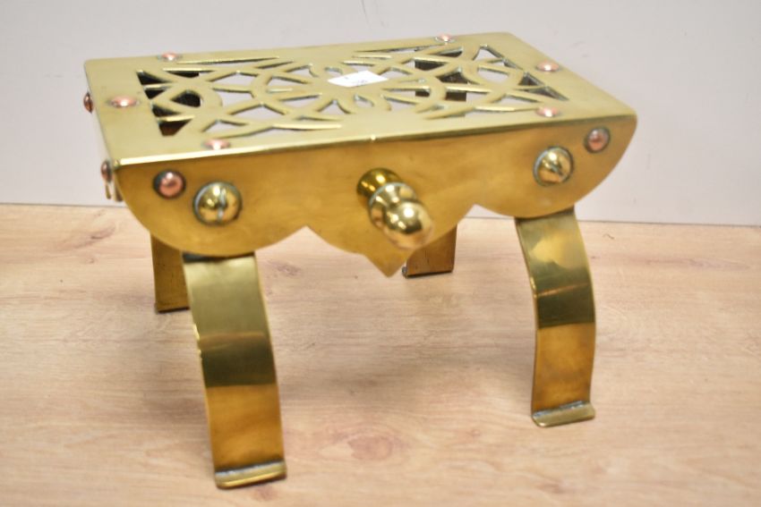 A selection of early 20th-century brassware, to include a Rampant Lion motif trivet; a decorative Arts and Crafts-style trivet; a Joseph Sankey and Sons (JS&S) crumb scoop; a brass bowl initialled 'CJ'; and more (5), all in good used condition.