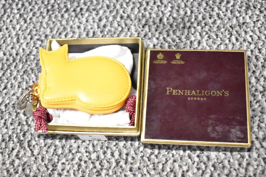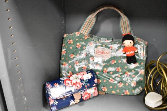 A collection of 2000s-modern handbags and purses, comprising a Cath Kidston green floral PVC coated cotton handbag and navy floral purse, two James Lakeland messenger bags in black leather and tan leather respectively, each measures 9 x 10 inches, a similar Radley cross-body back in black leathers with green detail and pink logo label, along with a Penhaligon's orange leather cat keyring purse, boxed and unused.