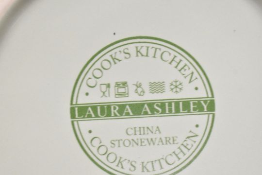 A modern Laura Ashley china stoneware Cooks Kitchen mixing bowl, in a soft pastel green, featuring a central pink floral design, marked to base, 22cm across.