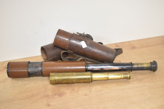 An early 20th-century Houghton Butcher WWII Scout Regiment MKII S Telescope HBM CO OS 126 GA of brass and leather, number 5255, made for the British Army, having its original leather carry case with buckle retained cap, engraved to tube next to eyepiece; sold with a smaller brass telescope, (2), both to be in good used condition.