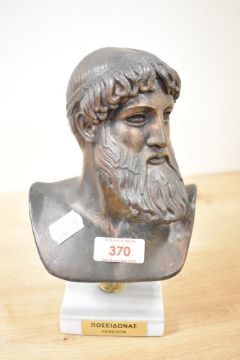 A 20th-century metal bust of Poseidon on a marble presentation stand with plaque; unmarked, 21cm.