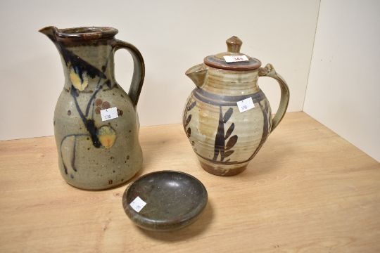 A mixed 20th-century lot, to include a Wenford Bridge studio pottery lidded jug by Jane Herold, decorated with foliate motifs and impressed seal marks to the base edge; a studio pottery stoneware pitcher with a speckled glaze featuring abstract forms and colours in a stylised design, unmarked; and a small hand-carved marble bowl in deep green and brown stone, (3).