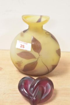 A late 19th-century French Émile Gallé Art Nouveau cameo glass vase, featuring layers of soft amber/warm yellow glass overlaid with contrasting purple, acid-etched and carved to create intricate clematis designs, marked to the base and back, 14cm; sold together with a Lalique 'Coeur' crystal 'Knot Fuchsia Entwined Heart' paperweight, (2).