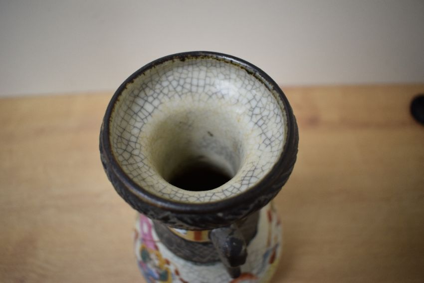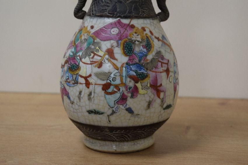 A 19th to 20th-century Chinese crackle-glaze porcelain vase, of ovoid form with a flared mouth descending into a short, slender neck and gently rounded body, featuring two relief handles shaped as elephant heads and two repetitive bands, decorated with a colourful battle scene depicting polychrome enamel figures in traditional armour, both on foot and on horseback, seal mark to base, 23cm.
